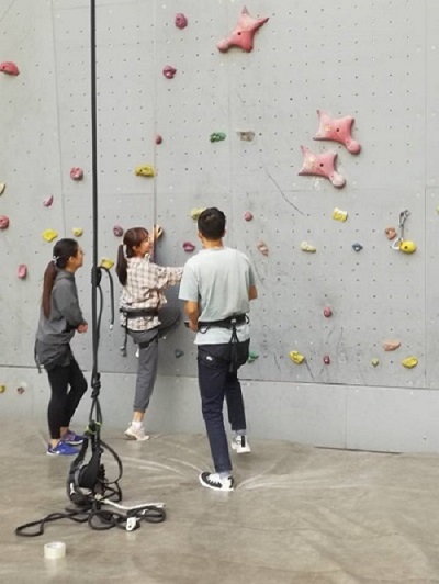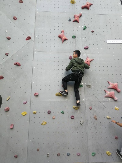 本次活动是由沈佳锋同学提议的攀岩体验,在学校西操旁的的攀岩墙进行。下午三点半左右,就陆续有同学来到了学校的攀岩墙。此时的攀岩墙边已经有不少人在排着队等着体验,还有的正在攀岩墙上往上爬着。等了几分钟,同学们在沈佳锋同学的帮助下穿戴好了攀岩的装备,简单的观察了一下向上爬的路线,就开始了第一次的攀岩体验。由于是第一次进行攀岩的体验,大家都没有把目标定在爬完全程登顶,而是或多或少的爬了一些后就选择了跳下来休息,在下面看着别的同学们的攀爬。休息途中,我们也看到了攀岩的大佬们的展示,从墙底到墙顶只要几十秒,这样的墙对他们来说根本没有难度。最后,在一些同学休息完进行了第二次尝试后,本次的团日活动结束,同学们陆陆续续地离开攀岩墙。