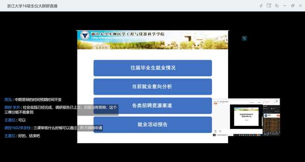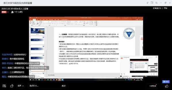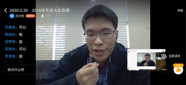 2020年3月20日下午1:30,生仪学院2016级本科生线上年级大会正式开始,2016级兼职辅导员吕可伟同学主持会议,生仪学院副院长周泓老师、党委副书记杨扬老师、教学科科长齐炜老师、团委副书记王嘉忆老师、就业兼职辅导员潘昌蓉、2016级兼职辅导员梁太以及2016级全体本科生参与本次大会。