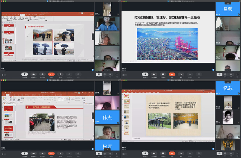会议第一项,通过数位同学分享导学学习习近平总书记在浙江考察时的讲话精神。李原同学梳理总书记在浙江考察的时间线,通过危与机的辩证关系论证了如何统筹规划复工复产与防控疫情,指出青马学员差异化发展自己的本领,强调科技是未来经济发展的另一重要引擎。接下来三位位于宁波,湖州,杭州三地的同学,重温总书记的考察路线,对总书记重要讲话精神结合当时当地作详细的叙述。位于宁波的孙凡原同学则分享了港口复苏的力量,舟山港解封后与世界再次联结,出口货物出的去,进口货物进得来;随着总书记下车间的步伐,强调了民营经济的重量,中小企业有活力,经济发展才会有动力。位于湖州的潘思红同学则讲述了绿水青山就是金山银山的故事。保护生态,生态才会回馈你。安吉余村在两山理论的指引下,发展农家乐,民宿产业,树立安吉白茶品牌,取得经济发展农民脱贫的巨大成就。位于杭州的蔡俊南同学则讲述总书记与浙江的渊源,分享了西溪湿地城市之肺,杭州城市大脑让城市更聪明更智慧。