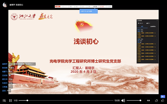 优秀党员华奇峰、官孝清、崔晓宇三位同学分别进行了题为“科技为盾 守卫健康”、“不忘初心,方得始终”、“浅谈初心”的新的分享。徐皓宸同学在听了优秀党员的分享后,感慨道:只有时刻牢记自己入党时那份最纯真的初心,才能在未来我们遇见困难时给予我们无穷的力量,才能让我们始终忠诚的跟党走,才能让我们的事业始终走在正道上。