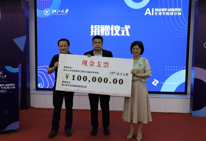 凯实科技董事长黄鹤代表凯实科技向生仪学院捐赠十万元,专项用于支持学生的创业创业教育,生仪学院副院长周泓教授、党委副书记杨扬老师接收捐赠。
