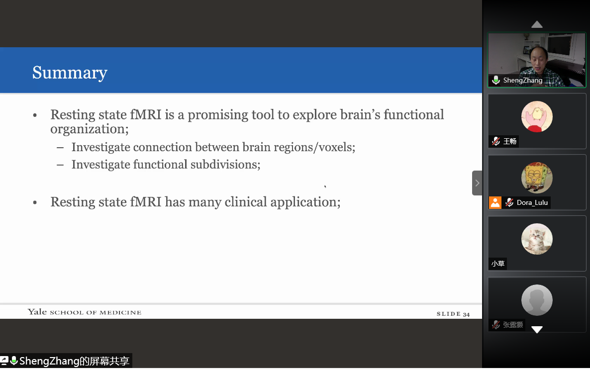 2020年11月5日上午,生仪学院第119期青年学术沙龙暨研究生科研能力提升系列活动在线上如期举行。来自美国耶鲁大学的张盛教授为我们带来了主题为“静息状态fMRI分析及其在成瘾神经科学中的应用”学术报告。
