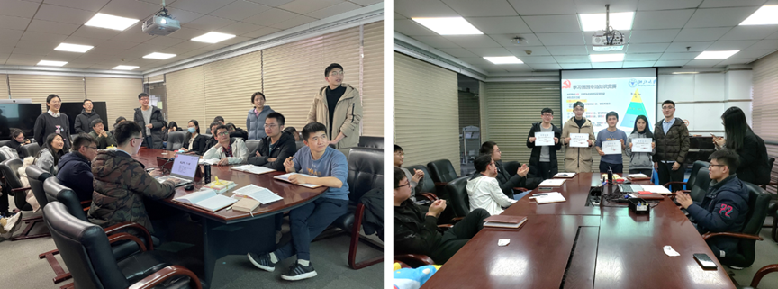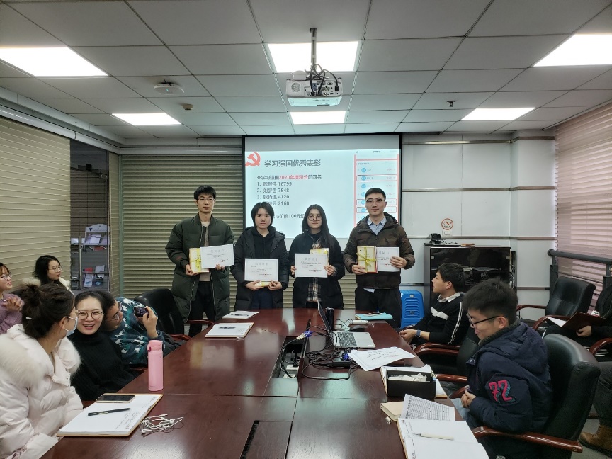 之后,支部进行了学习强国专项知识竞赛活动。首先支部对2020年度在学习强国学习中表现优异的魏鑫伟、刘梦雪、张钧煜和高凌云四位党员同志进行了表彰,鼓励支部其他同志向他们学习。随后,为了提升党员学习强国的热情和积极性,支部特地组织了“学习强国”专场知识竞赛,知识竞赛题目全部由支委同志出题,内容涵盖了党史校史、国学文化、天文地理、军事历史和生活常识等方方面面,以寓教于赛,寓教于乐的形式向支部成员宣传学习强国的重要性和趣味性,以吸引支部同志今后更好地在学习强国平台上进行学习。支部同志积极踊跃参与,活动气氛热烈。支部所有党员和积极分子共分为六组,各小组成员间团结合作,竞赛积分你追我赶,不甘落后。经过必答题、抢答题和个人巅峰对战三个环节,最终角逐出了前三名的队伍,王肃杰同志凭借精彩表现获得了个人赛冠军。通过此次“学习强国”专项知识竞赛,支部同志们进一步加强了对学习强国平台的了解,也希望每位党员同志借此次知识竞赛的机会,继续加深对党的相关理论知识的学习和理解,努力学习专业知识,发挥专业特长,做有理想、有本领、有担当的时代新人。