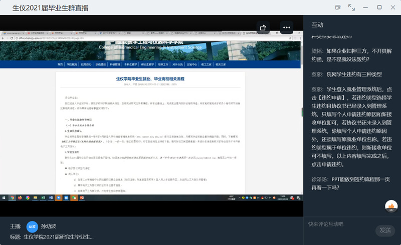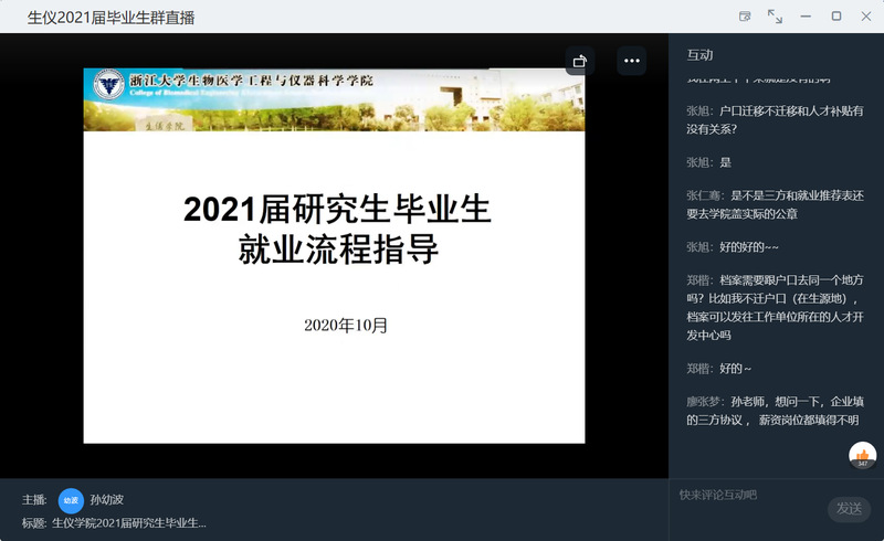 2020年10月23日,生仪学院2021届研究生毕业就业动员大会在线上举行,生仪学院团委书记孙幼波老师,就业兼职辅导员潘昌蓉、全体2021届研究生毕业生参与本次大会。