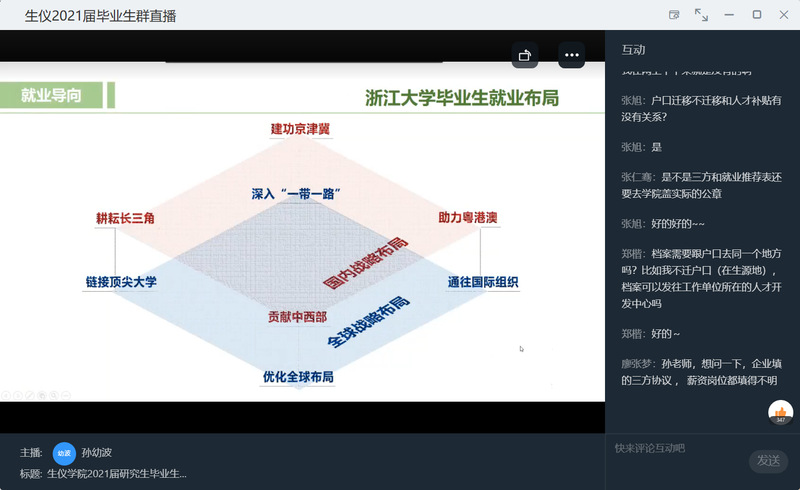 首先,生仪学院研究生辅导员孙幼波老师向各位2021届毕业研究生就学校的培养人才目标和就业导向展开了介绍,鼓励同学们理性考虑,定位自己的人生理想。同时,孙老师强调了疫情大背景下严峻的就业形势,希望同学们遵循“先就业后择业”的指导意见。