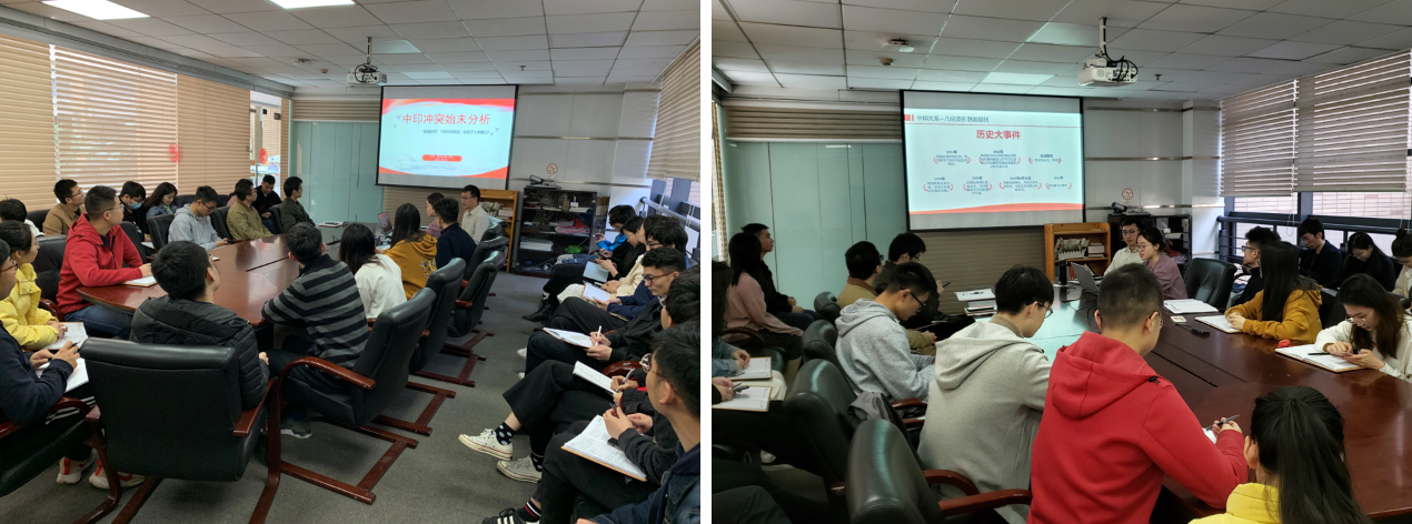 之后冯敏同志分享了《中印冲突始末分析》,以中印两国去年在加勒万河谷爆发的边境冲突为索引,回顾了近代以来中印两国关系的波折发展,以及建国以来两国爆发的主要边界冲突事件,并重点介绍中方在边界问题上的一贯立场以及中国坚持对话协商、维护自身主权的态度。魏鑫伟同志对中国现阶段外交形势与策略进行了补充讨论分析。