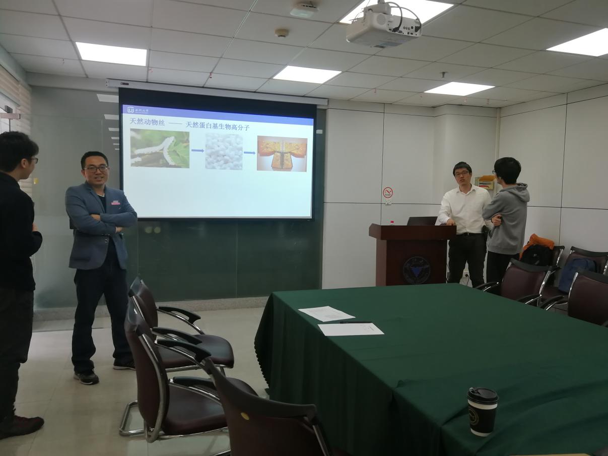 本期沙龙主题是天然丝蛋白的结构、性能及生物医学应用。郭成辰博士首先用蚕丝蛋白和蜘蛛丝蛋白引出其研究工作的意义,之后介绍了利用核磁共振被谱技术表征纳米材料表界面化学和天然生物高分子,以及丝蛋白基生物材料的加工和生物医学应用。主要涉及了一种新的热处理方法,可以将再生的天然蚕丝直接转变为具有力学性能可调的坚固结构材料,热处理过程首要步骤是制备非晶丝蛋白纳米小球,然后经过加热加压处理使得丝纳米材料致密化并融合成块状材料,通过结构设计和3D打印等可以将丝基材料加工成棒、骨钉状或耳管状,这对于其在医学上的应用具有重要的意义。