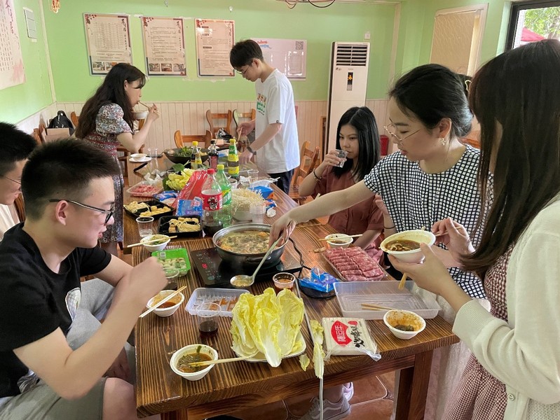 在锅底、蘸料、菜品均准备完成后,大家坐在一起开始了正式的火锅大餐。大家通过美食的享用与生活交流增强彼此感情,拉近彼此的关系,一边不停的涮菜,一边开心的聊起了天,聊到了过去的工作、未来的计划、当前的学习科研生活、家乡以及一些时事热点。