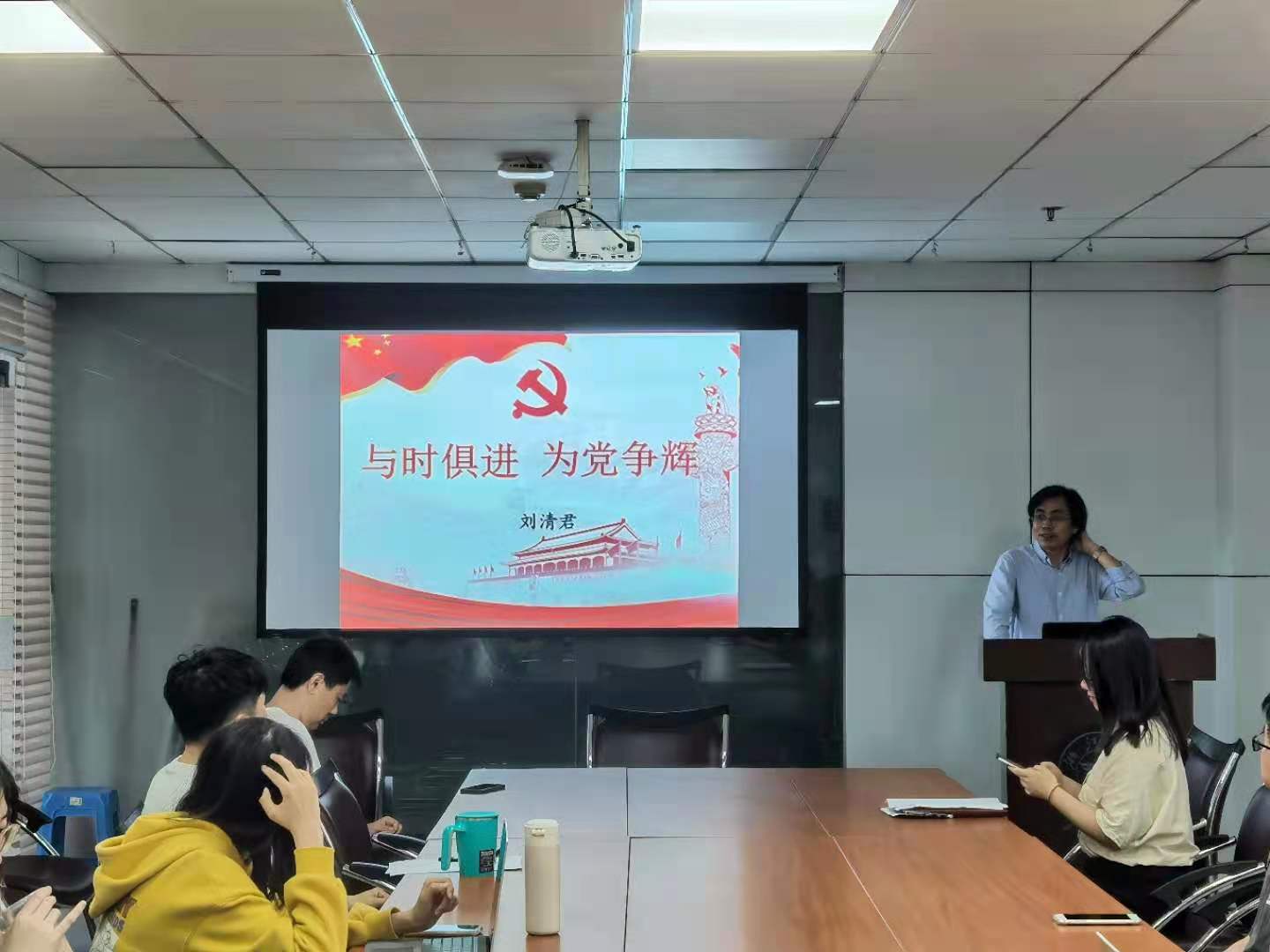 首先,党委委员刘清君以“与时俱进,为党争辉”为题,围绕《习近平新时代中国特色社会主义思想学习问答》,为同学们展开了一堂生动形象的党课。他先分享了在广东参观“迈瑞医疗”的所感所想,以亲身经历讲述改革开以来科学技术、市场经济、文化艺术的飞跃。最后落脚到《问答》中“为什么党的十一届三中全会、十八届三中全会是跨时代的?”的问题上,加深了同学们对新时代中国特色社会主义的优越性的理解。