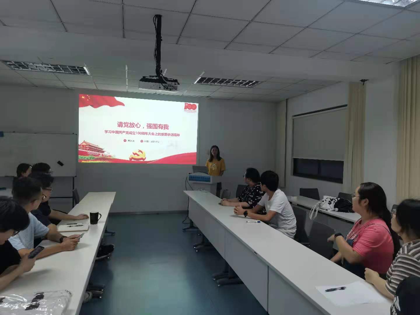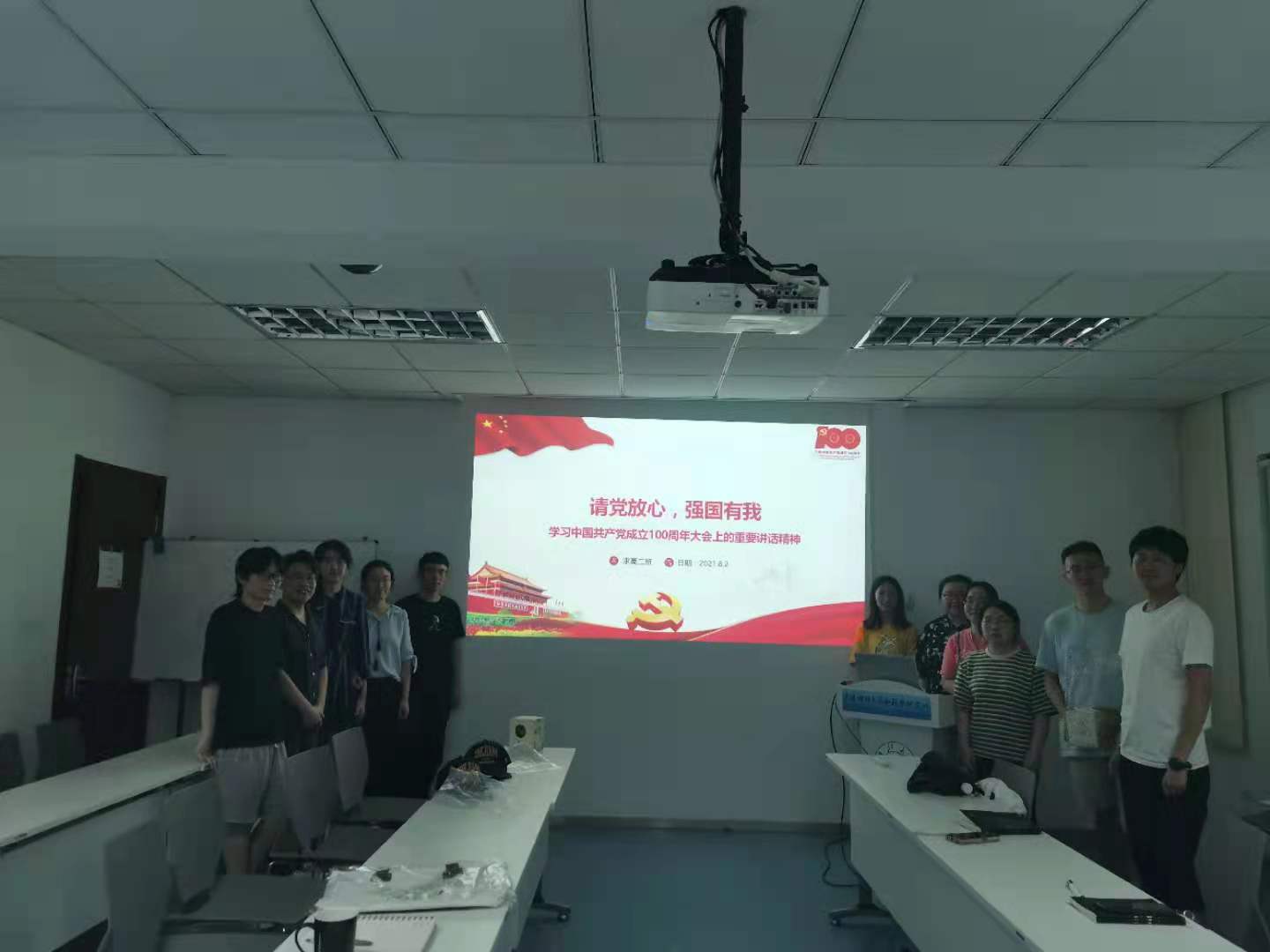 团支书焦冰洁同学为大家分享了习近平总书记的重要讲话精神,她先从 “四个伟大成就”回顾了党的百年光辉历程,然后,通过“九个必须”展望了中华民族伟大复兴的光明前景。在座的同学们满怀对国家未来的憧憬,发出了“请党放心,强国有我”的志愿,大家都收获满满。