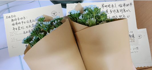 同学们精心准备了贺卡与鲜花,向学院老师们送上贴心的问候,表达自己的感谢与祝福,张芬妮等老师祝愿他们在新的征程里走出生仪人的风采,学习旅途一帆风顺。