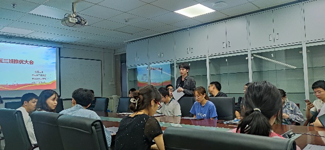会议的第一个环节是迎新,来自五湖四海的新同学分别介绍了自己的家乡、导师以及兴趣爱好,大家对每一位同学都表示了热烈的欢迎。班长陈龙表示,希望新的血液加入,能给这个集体带来新的活力。迎新环节结束后,三位推优的同学起立朗读了各自的发言稿,经过讨论表决后,一致同意三位同学的推优。
