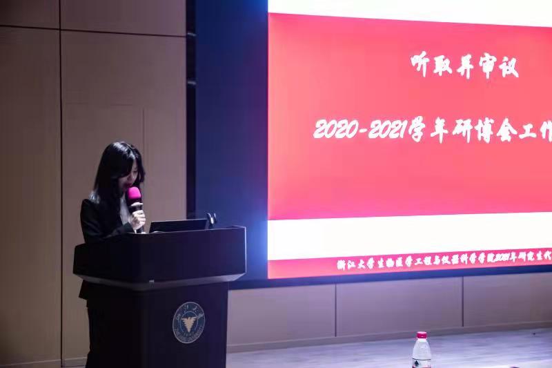 研博会2020-2021学年主席团成员林佳帆向大会做工作汇报,就过去一年的工作进行了总结和回顾,指出了在工作中发现的一些问题,也提出了新一届研博会工作努力的方向。