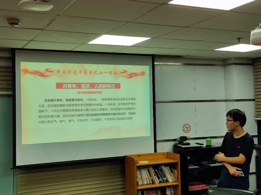 进入活动的第二部分,全体团员在团支书熊楚涵的带领下,共同学习习近平总书记的“七一”讲话精神。习近平总书记发出宣告:“经过全党全国各族人民持续奋斗,我们实现了第一个百年奋斗目标,在中华大地上全面建成了小康社会,历史性地解决了绝对贫困问题,正在意气风发向着全面建成社会主义现代化强国的第二个百年奋斗目标迈进。”不仅总结了至今党的成就,明确了我们党未来道路的前行方向,也对我们青年一代的未来选择做出了一定程度的指导。未来属于青年,希望寄予青年,新时代的中国青年要以实现中华民族伟大复兴为己任,扛起社会责任,不负党和人民的殷切期望。