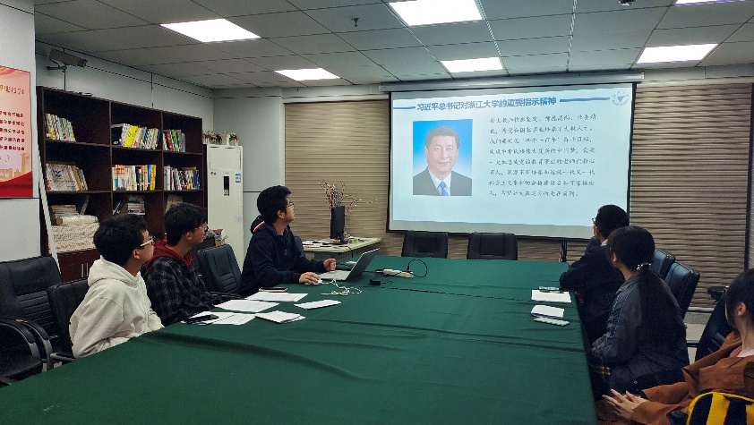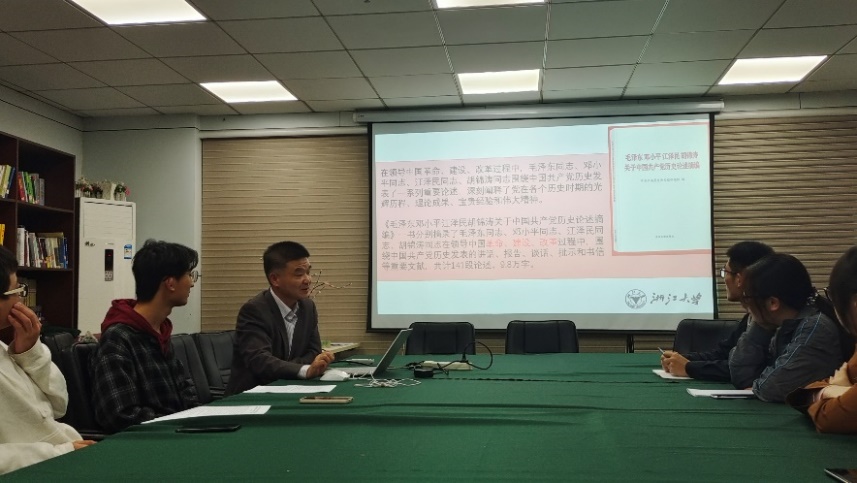 第二项议程由党委委员宁钢民老师分享《毛泽东邓小平江泽民胡锦涛关于中国共产党论述摘要》。宁老师从革命、建设、改革三个重要历史时期来介绍,也希望通过历史的回顾,让大家感受到我们党这些年风雨兼程走过来的不容易,以及今后对于我们青年学生来说,不能忘记肩上背负着的使命。