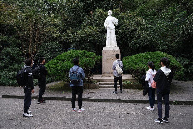 秋意渐浓的西湖孤山,虽然有风筝下的欢声笑语,但孤山依旧在灰白色调中呈现着庄严与肃穆。我们踱步来到了孤山湖畔矗立着的鲁迅雕像,“横眉冷对千夫指,俯首甘为孺子牛”,我仿佛看到了他望着曾经水深火热的中华大地,无言地沉思;转角遇见是巾帼英雄,我们仰望着秋瑾,坚毅的眼神中确有“身不得,男儿列;心却比,男儿烈”的大义豪情;曲折的水上小径旁,是林启先生偏居一隅的小屋,毕生心血开两浙新学,最后魂归孤山。