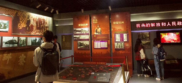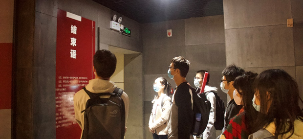 穿过拥挤的灵犀隧道,怀揣着一颗虔诚的朝圣之心,同学们迫不及待地登山而上,然后在恢弘的场馆面前静心驻足、弯腰,这是对先贤斗争的崇敬与膜拜。进入会场,团支书曹正杨也是做足了功课,作为杭州本地人的他对祖上的历史颇有了解,给同学们娓娓道来。党的狱中斗争、配合国民党北伐、土地革命战争、抗日……这个时期的党是红色与黑色所交织的,鲜血、关押、不屈、抗争,残酷但从不放弃,终究是为现在的我们迎来了胜利的曙光。想起电影《长津湖》中一句话:“这场仗如果我们不打,就是我们的下一代要打。”先辈的付出,当珍惜而珍重。
