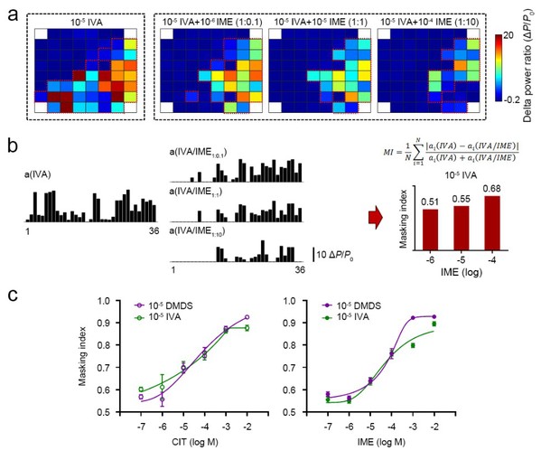 自然环境中,气味信息包含了大量不同的气味分子,气味分子之间的相互作用使得嗅觉感知效果并不是单一气味的线性叠加,而是气味“整体”的感知。研究发现,混合气味的刺激强度要小于其单种成分刺激强度的总和,这个现象说明一种气味分子有可能抑制其他气味分子的响应。通过一种气味去抑制另外一种气味感知的现象被称为气味掩蔽,实际上,气味掩蔽的本质是感知的变化,而不是气味的消失。目前用于检测气味的技术如气相色谱分析只能分析化学种类,而仿生电子鼻技术虽然对低浓度的特定气味分子检测具有优势,但并不能评价气味分子间相互作用对感知效果的影响。