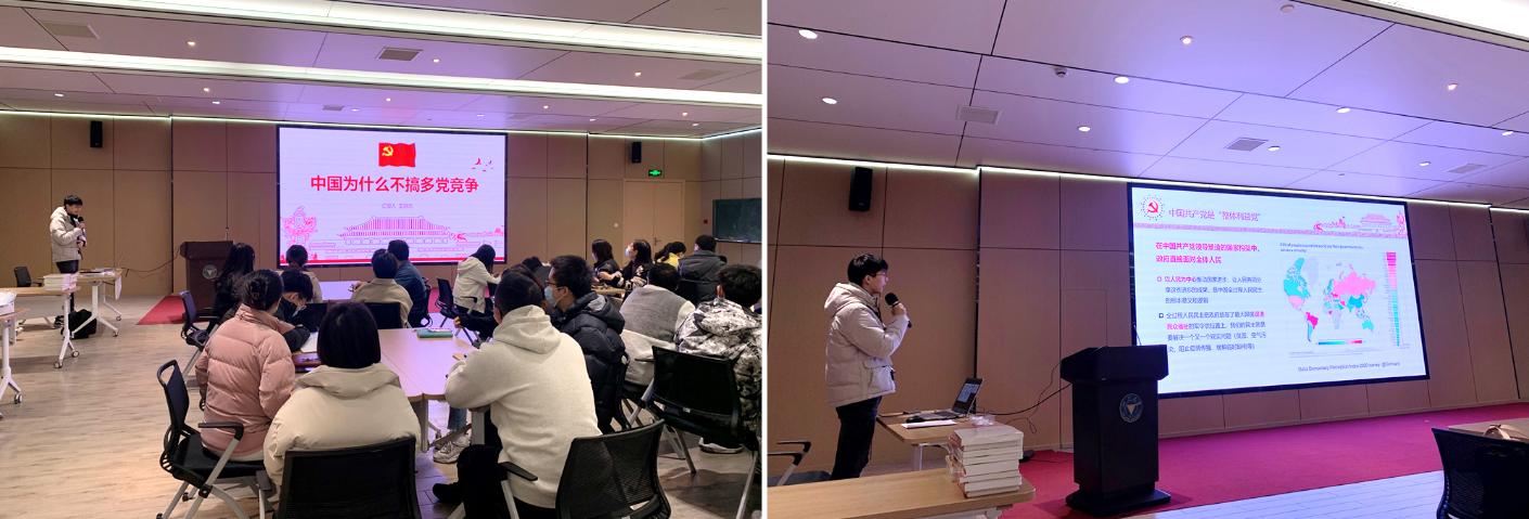 首先进行的是“一党员一党课”环节,支部邀请王肃杰同志为大家分享了《中国为什么不搞多党竞争》的相关思考。王肃杰围绕“全过程人民民主”这一话题,结合中西方的具体实践案例,生动阐释了中国的政治制度和民主模式为何优于西方的多党竞争。中国的政治制度既有选举民主的基本要求和重要内容,也有协商民主的特有形式和独特优势。中国共产党作为“整体利益党”,始终以人民为中心推动国家进步,运用协商民主和民主集中制,实现人民整体和长远利益的最大化,这是中国人民民主的真谛。党课分享结束后,董泽成、刘梦雪等支部同志们针对这一话题继续进行了广泛的讨论交流。