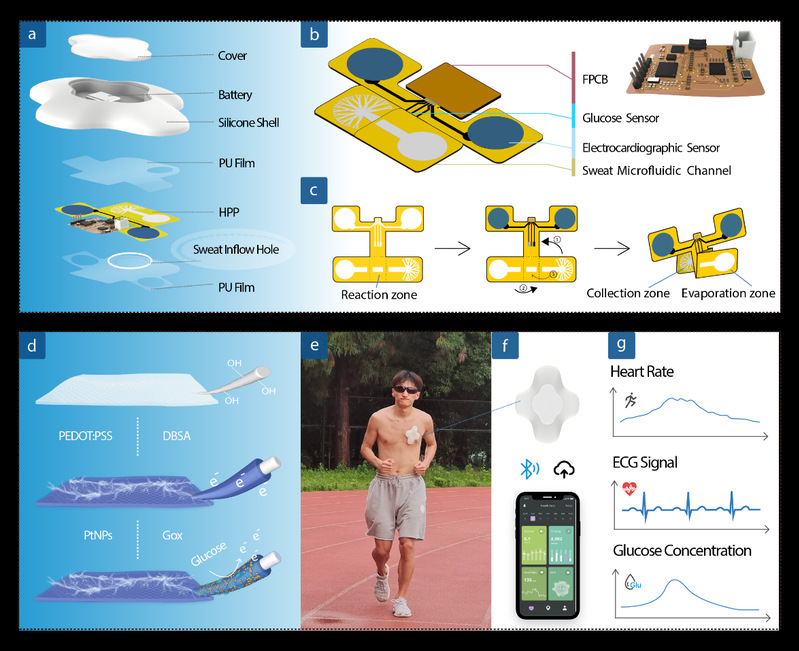 人体在运动过程中会经历复杂的生理生化信号变化。追踪这些指标可以提供与人体健康相关的实时数据。这些设备需要持续实时监控,具有高集成度、灵活性等一系列优点。之前报道的集成装置能够跟踪生化分析物和生理信号,但仍存在许多问题需要解决。在此,我们设计了一种多功能和柔性的导电水凝胶-纸贴片(HPP),它能在运动中同时实时监测这两种信号(图1)。高孔隙率的PEDOT:PSS水凝胶在纸纤维上的自组装使HPP具有良好的导电性和良好的水润湿性,以实现高效的电子传输和物质扩散,从而使其能够作为一个低阻抗的心电电极和高灵敏的葡萄糖传感器。同时,自发的毛细效应使纸片可以作为微流体通道用于捕获和分析汗液。此外,HPP与柔性印刷电路板(FPCB)的集成和人体实验验证了柔性、低成本和多功能设备作为电生理和生物化学信号的同步监测的可行性。