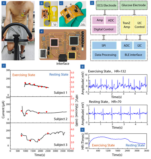 文章首先探究了PEDOT:PSS凝胶负载于纸纤维的形成过程并对其进行表征,验证其具备良好的导电性、长期的稳定性,来说明导电纸凝胶具备作为柔性电极的基本特征。接着文章从生理检测、生化检测、汗液流道三个方面来验证贴片性能。生理检测部分对比商业电极,发现在心电信号的频率(0.5-100Hz)条件下,HPP的阻抗更低且稳定。使用相同的放大电路和相同的位置进行的心电信号检测也表明,HPP的测量结果与商用心电电极相似。生化检测方面,用葡萄糖氧化酶修饰后的HPP,传感器的灵敏度可以达到325.99± 0.8μA·mM-1·cm-2,灵敏度优于许多汗液葡萄糖检测研究。长时间稳定性、长期稳定性,抗干扰性的实验证明该电极具备能在长时间运动中保持测试的稳定。纸基汗液流道部分,我们模拟汗液流动过程,结果显示后进入通道的红墨水可以通过毛细效应推动通道内已有的墨水流动,说明纸基微流体装置的流通性具备实时采集汗液的要求。最后,我们将HPP与柔性印刷电路板(FPCB)的集成为测试器件,贴于志愿者体表进行运动测试(图2),在体运动数据论证我们的HPP可穿戴设备能实现运动中的生理生化参数实时监测。