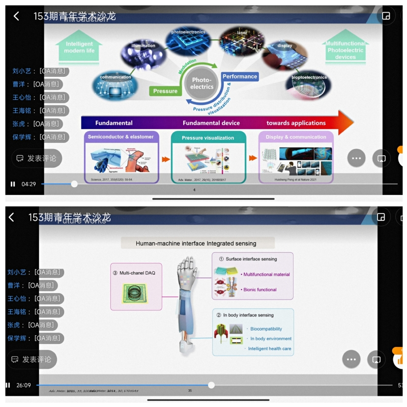 分享完最新科研成果之后,陈梦晓研究员介绍了多功能传感材料和器件领域的最新研发状况,以及强调传感设备的集成人类皮肤特性,更高的灵敏度、分辨率和集成性,实现多功能和可穿戴性的研发趋势,并结合具有自愈合、仿生功能的材料和器件的实例,探讨本领域研究在人类健康的实时监测、人工智能、机器人系统等领域的应用前景。