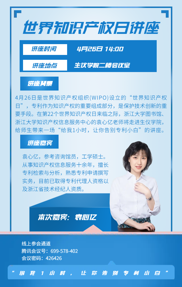 4月26日是世界知识产权组织(WIPO)设立的“世界知识产权日”,专利作为知识产权的重要组成部分,是保护技术创新的重要手段。在第22个世界知识产权日来临之际,德赢AC米兰中国官方网站图书馆、德赢AC米兰中国官方网站知识产权信息服务中心的袁心亿老师将走进生仪学院,给师生带来一场“给我1小时,让你告别专利小白”的讲座。