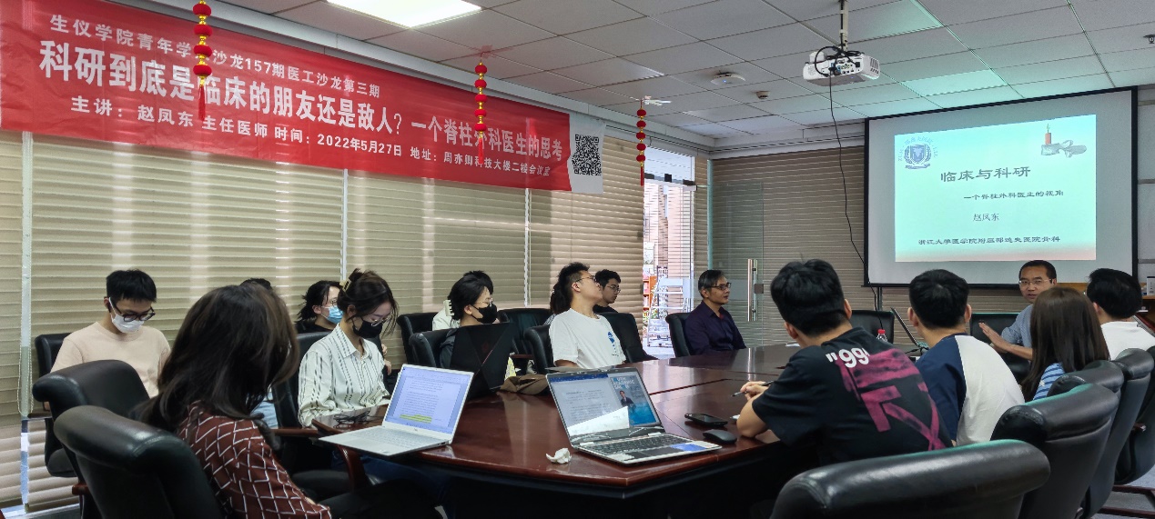 生仪学院第157期青年学术沙龙暨医工沙龙临床医生讲座系列活动第三期,于2022年5月27日下午如期在线上线下举行。脊柱外科主任医师赵凤东教授作“科研到底是临床的朋友还是敌人?一个脊柱外科医生的思考”专题报告。学院副院长林辉主持活动。