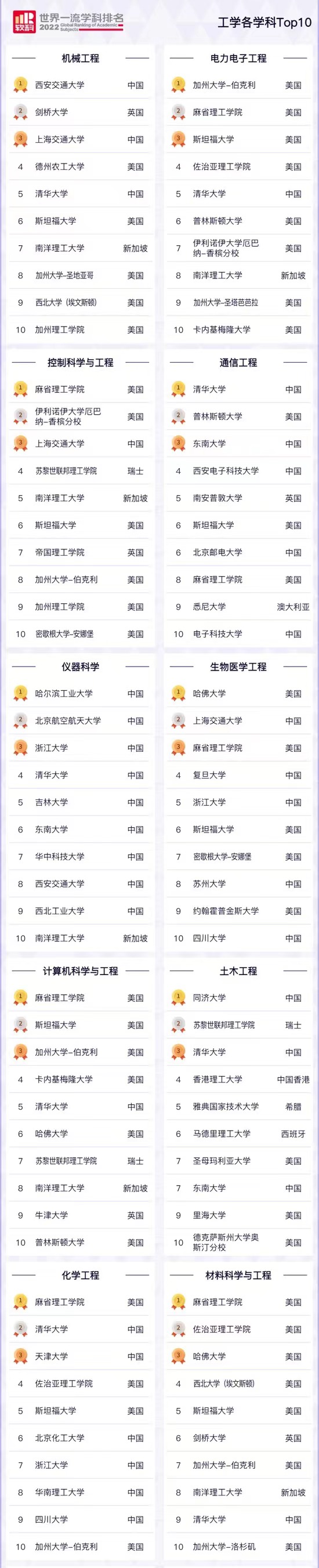 2022年7月19日,高等教育评价专业机构软科今日正式发布2022“软科世界一流学科排名”(ShanghaiRanking's Global Ranking of Academic Subjects)。2022年排名覆盖54个学科,涉及理学、工学、生命科学、医学和社会科学五大领域。其中德赢AC米兰中国官方网站在仪器科学学科中排名第三,生物医学工程学科排名第五。