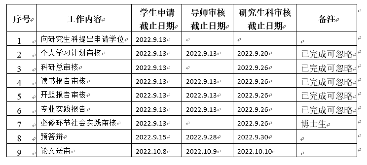 要求2022年12月10日前完成答辩,12月15日上午9:00-11:30、下午1:30-4:30提交相关材料至研究生科。请各位同学把握好论文质量和上传时间。毕业生登记表联系孙幼波老师,其他材料联系黄琪老师。
