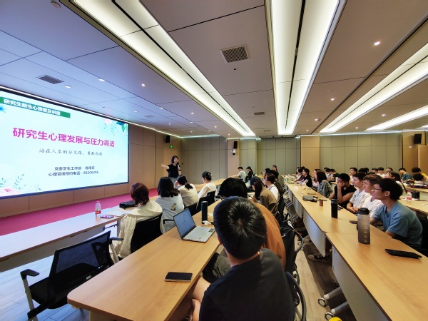 党委学生工作部陈南菲老师为同学们进行研究生新生心理普及讲座。陈老师用诙谐幽默的语言讲述了有关研究生心理发展与压力调试的内容,指出研究生新生正站在人生的分叉路口,需要关注自身压力,呵护身心健康,正确看待挑战,合理处理人际,在遇到心理困难的时候及时求助,过好当下,勇敢向前。