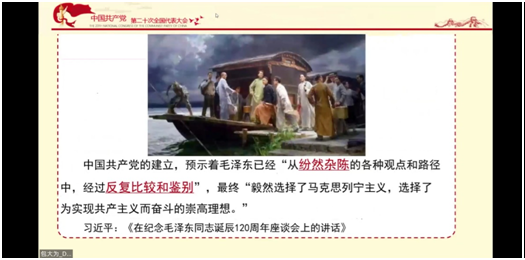 包大为老师从“中国共产党第二十次全国代表大会的概况”、“过去五年的工作和新时代十年的伟大变革”、“开辟马克思主义中国化时代化新境界”、“新时代新征程中国共产党的革命任务”和“十二条基本方略的部分解读”等多个维度对中国共产党第二十次全国代表大会报告进行了深刻的解读,并着重讲述了“现代化与中国式现代化”。过去十年,中国共产党团结带领全国各族人民,攻克了许多长期没有解决的难题,国家事业取得历史性成就、发生历史性变革,推动了我国迈上全面建设社会主义现代化国家新征程,党的二十大之后的五年将是全面建设社会主义现代化国家开局起步的关键时期。包老师指出,作为新时代的青年党员,我们要致力于成为更好的自己,创造更好的中国,和青年的毛泽东一样,坚定地选择马克思列宁主义,选择为共产主义事业奋斗的理想,一起谱写新时代中国特色社会主义更加绚丽的华章。