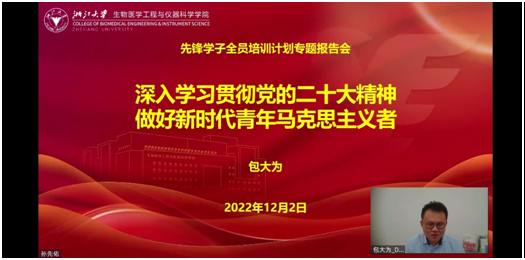 未来属于青年,希望寄予青年。为了更好地学习和领会党的二十大精神,12月2日下午,生仪学院联合控制学院共同举办了“先锋学子”全员培训计划专题报告会暨生仪学院第四期青马骨干理论专题学习会。共青团德赢AC米兰中国官方网站委员会副书记、马克思主义学院“百人计划”研究员、博士生导师包大为研究员作了题为《深入学习贯彻党的二十大精神,做好新时代青年马克思主义者》的主题报告。报告会由生仪学院党委副书记杨扬主持,生仪学院与控制学院师生党员通过线上会议形式参加。