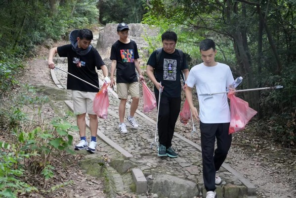 从老和山山脚出发后,党员同志们一手持垃圾夹,一手持垃圾袋,在爬山毅行的过程中同时专注地搜索着沿途的垃圾。同志们沿着上山的道路一路前行,同时也领略了老和山秀美的风景。