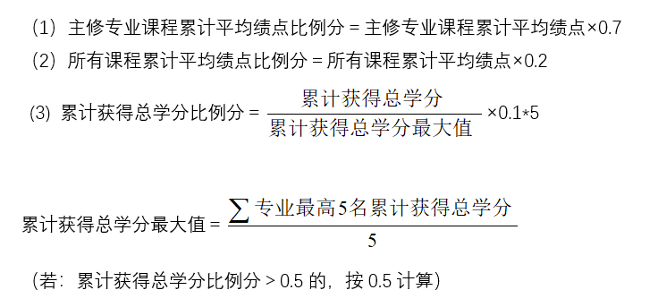 主修专业课程累计平均绩点作为主要评价指标占70%;所有课程累计平均绩点作为第二指标占20%,累计获得总学分作为第三指标占10%,具体算法如下: