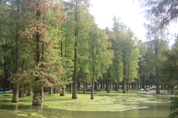 本次秋游第一站首先来到临安青山湖。秋高气爽,艳阳高照,一大早,老师们从圣鹤码头坐游船出发,湖面碧波涟漪,四周青山环绕、秀美清丽。抵达水上森林码头后,老师们游览了临安著名景点水上森林公园。青山湖素有“青山湖上湖山青,林映水中水映林”之美誉。深深的湖水中生长着茂密的树群,落羽杉挺拔粗壮,池杉亭亭玉立,一雄一秀,相映成趣。树影、湖光、山色、天景构成了一幅美丽的山水风景画。一片片树叶飘落在水面浮萍之上,远处游来几只野鸭和黑天鹅,湖面荡漾起圈圈波纹。树在水中长、鸟在枝头鸣,船在林间行,人在画中游。置身其中,令人心旷神怡。