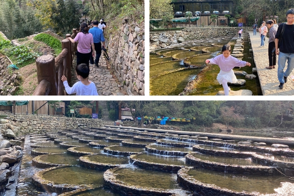 随后,老师们来到位于龙上村的龙鳞坝。沿着陡峭的天梯往下走,老师们进入一片景区丛林。首先映入眼帘的是一处瀑布,飞流直下的溪水汇入龙潭,龙潭中的水清凉澄澈,潭水深不见底。再往林中走去,郁郁葱葱的竹叶随风飘曳,洒下斑驳的光影。山谷清幽、林草丰茂、竹影婆娑、溪水潺潺,宛若仙境。龙鳞坝上,一圈圈半圆形的石碓构成一片龙鳞状的斜梯,溪水自上而下湍急地流过,留下一汩汩雪白的浪花。