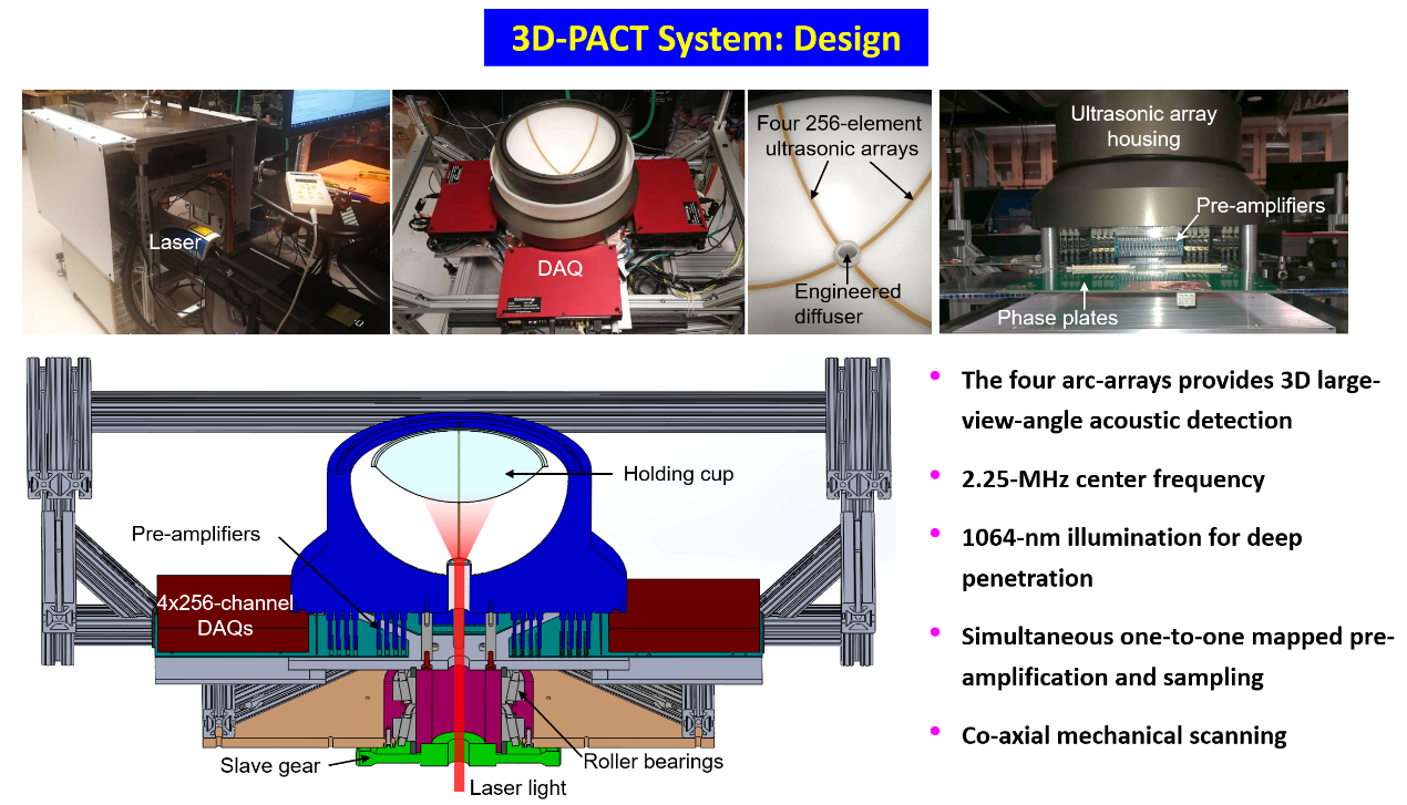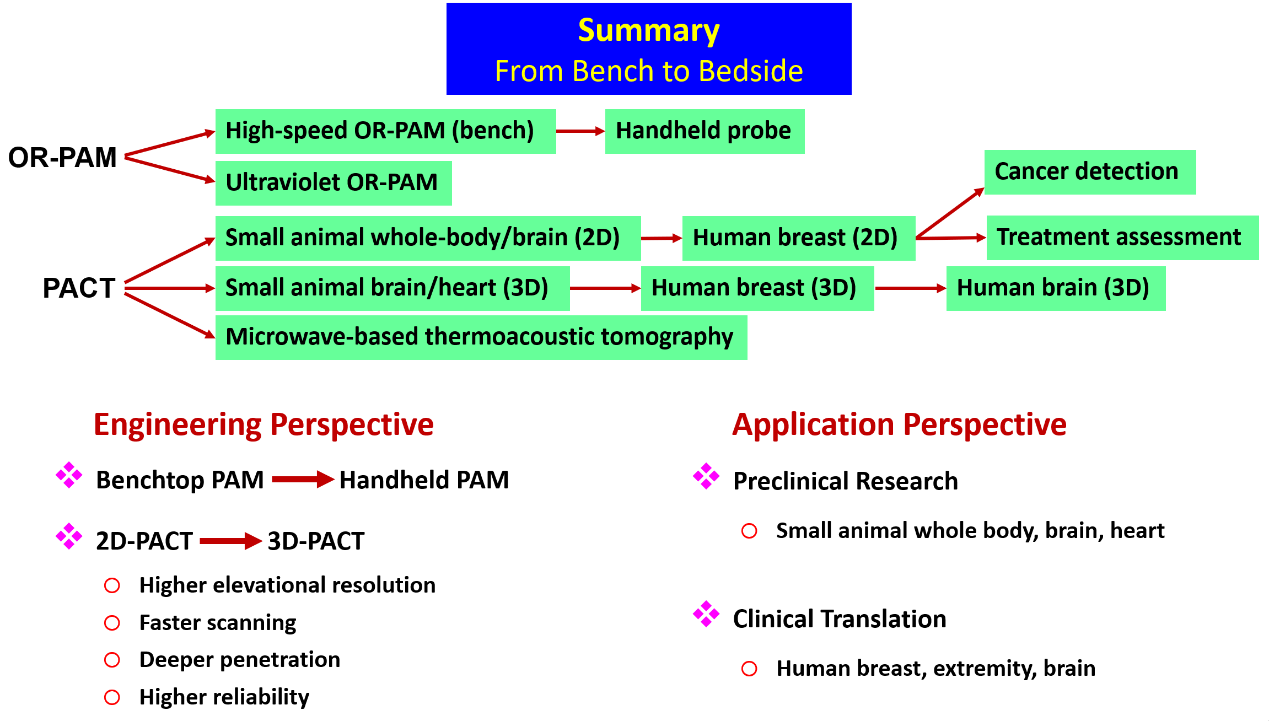 林老师首先讲述了光声成像相比传统成像方法,具有可兼顾成像深度及分辨率、成像速度快、成像信息丰富、没有电离辐射等优势,充分体现了光声成像的价值与意义所在。随后,林老师详细介绍了光声成像的基本原理以及光声成像的两种表现形式:光声显微成像(OR-PAM)和光声CT成像(PACT),从实验台走向临床应用的发展过程。其中,OR-PAM在肿瘤切源的病理检测中具有独特优势,因其无需进行生物组织样本染色且检测速度较快,可以在术中进行病理诊断从而提升手术质量。接着,林老师详细讲述了PACT的发展过程,从最初应用于小鼠的大脑功能成像,逐步应用于人体乳腺癌的早期诊断与治疗效果评估中。PACT通过检测肿瘤微环境的血管增生,提供与现有技术互补的成像信息和优势,在乳腺成像中具有良好的临床应用前景。林老师分享了他过去所研制的PACT成像系统及在乳腺癌病人中的成像结果,分析了PACT技术广泛应用于临床所面临的挑战。在报告的最后,林老师讲述了光声成像技术从2D发展到3D成像的过程,在实现了更高空间分辨率的同时开拓了更多的临床应用场景(如心脏、大脑成像等)。
