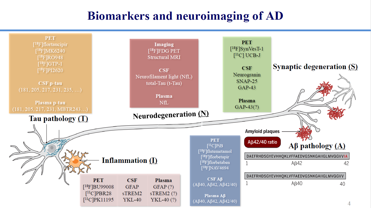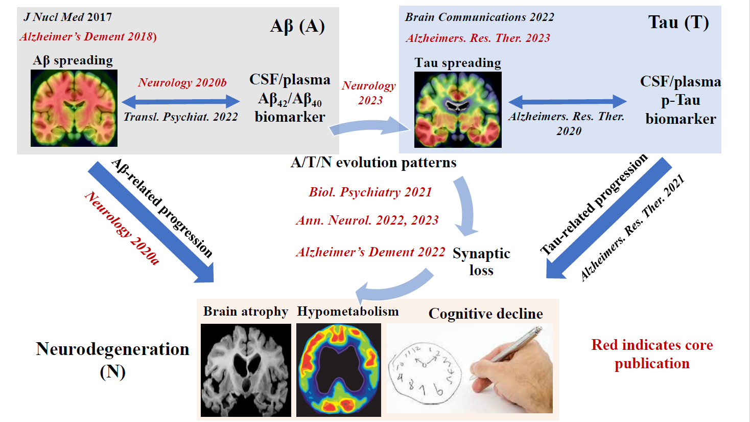 报告围绕利用生物标志物和神经影像技术对阿尔茨海默病的早期诊断展开,介绍了使用Aβ病理作为早期阿尔兹海默症病发的关键以及有关tau spreading的研究。此外,还介绍了相关生物标志物与指标应用其他疾病诊断的研究成果,并在最后梳理了其团队研究成果的时间线与关联。