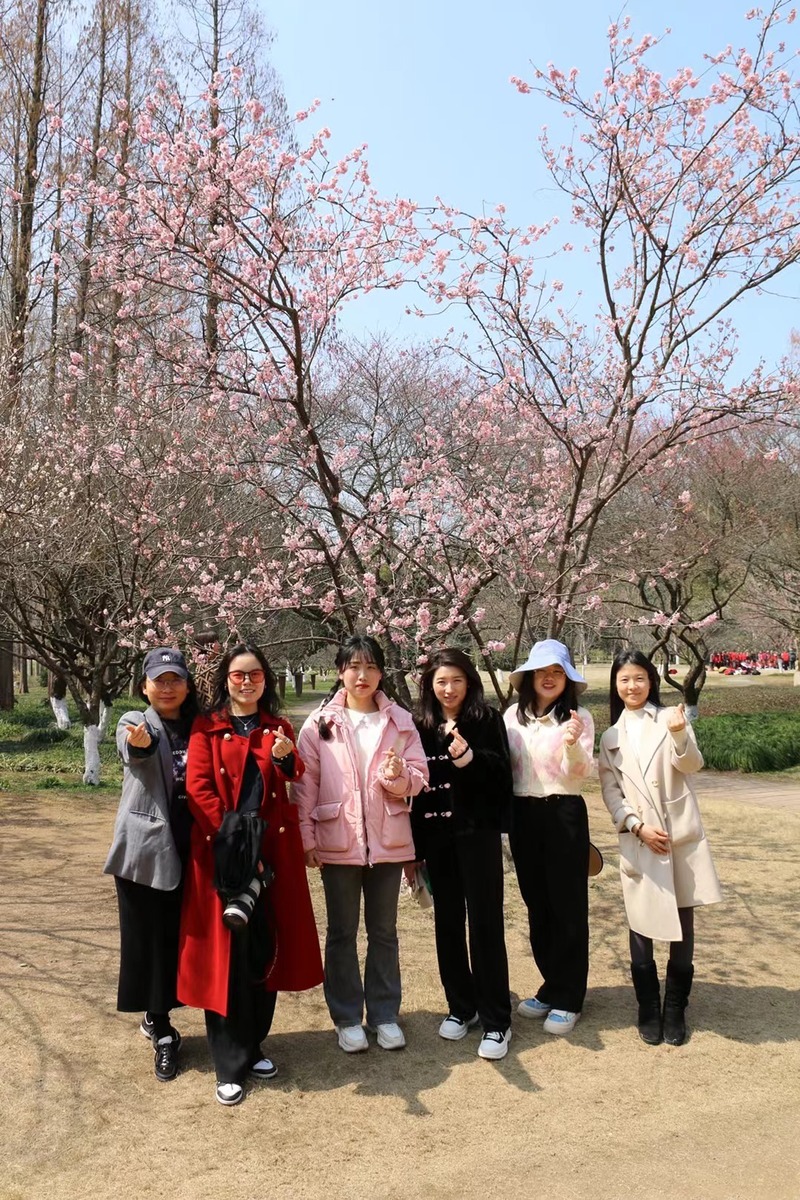 步入三月不久,春天的气息在植物园中已弥漫开来。第一波樱花悄然绽放,粉嫩的樱花、碧绿的树叶、湛蓝的天空,春和景明、微风荡漾。樱花树旁有几株梅花正盛,梅樱同芳、花颂祥和,煞是难得。日光透过摇曳的枝叶在石板路上留下斑驳的亮光。女教职工们感受着植物园这片绿色森林的宁静和初春花海的芬芳,在美的享受中将琐碎的日常抛诸脑后,身心沉浸在大自然的怀抱中。一路上,女教职工们一边赏景一边闲聊着。大家纷纷拿出手机和相机记录下这一难得的时刻。