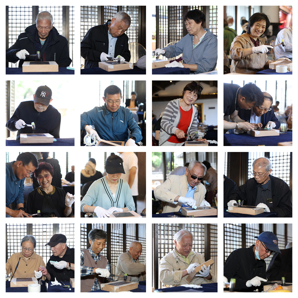 在博物馆三楼,欢乐的劳动开始了。据说这项活动既可以锻炼体力、调养性情,也可以提升审美感受。随着阵阵乒乒乓乓的打击声,浮雕渐渐显现出来,再用搽铜砂纸精心打磨,漂亮的艺术品就出炉了。有的作品是毛主席的草书“天天向上”,有的则是一个大大的“福”字,或者则是一些精美的“寿纹”。因为是龙年,大部分老师选择了龙的图像。虽然图案相似,但是每个人都一眼就认出了自己的作品。博物馆几位老师帮助合作,还为老师们的作品加上了精美的相框。大家爱不释手,仔细揣摩,只见古朴华贵,铜光闪烁。方寸铜板上的点点滴滴,仿佛蚀刻的就是自己的艺术人生,千锤万凿,彰显的是自己不变的灵魂。