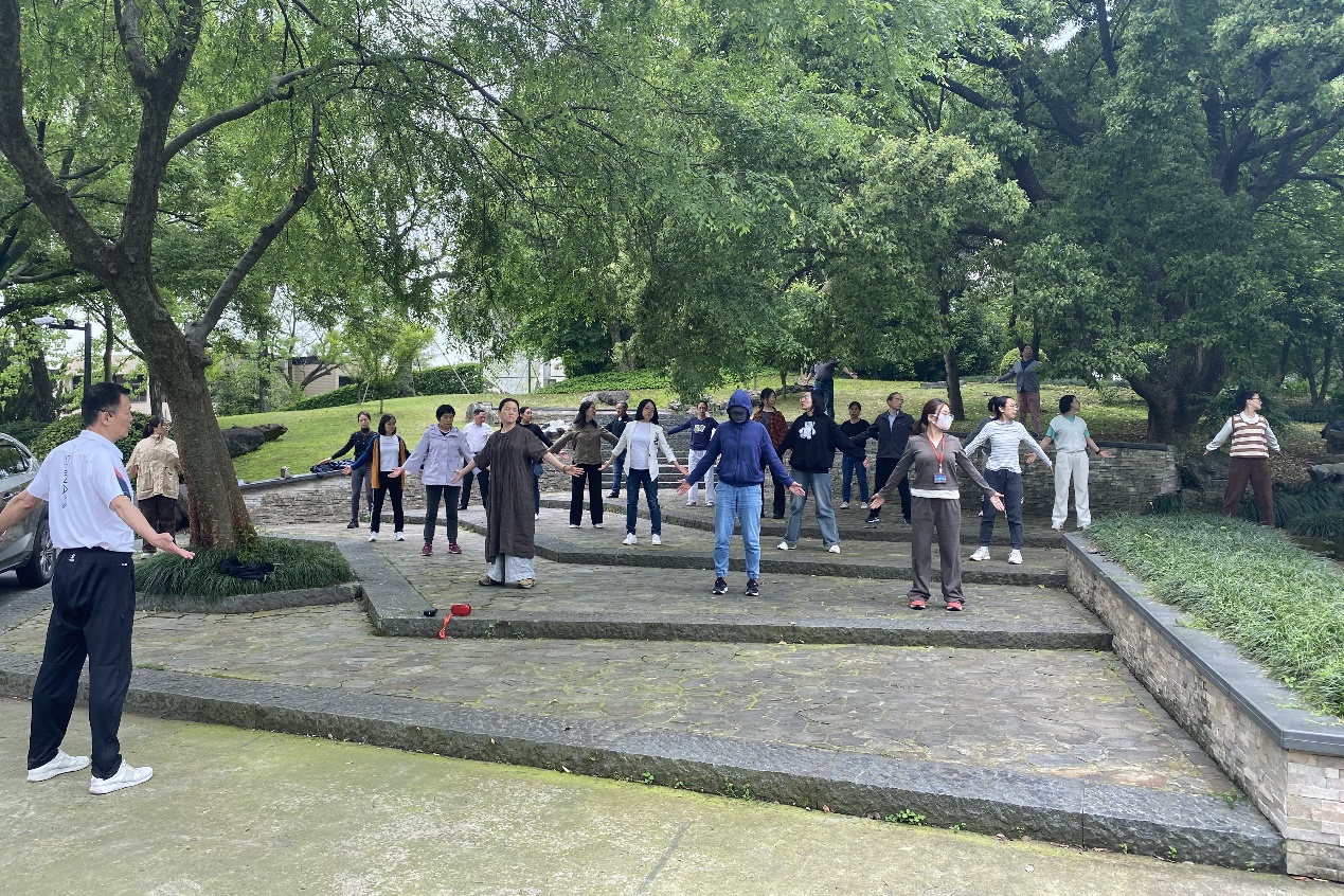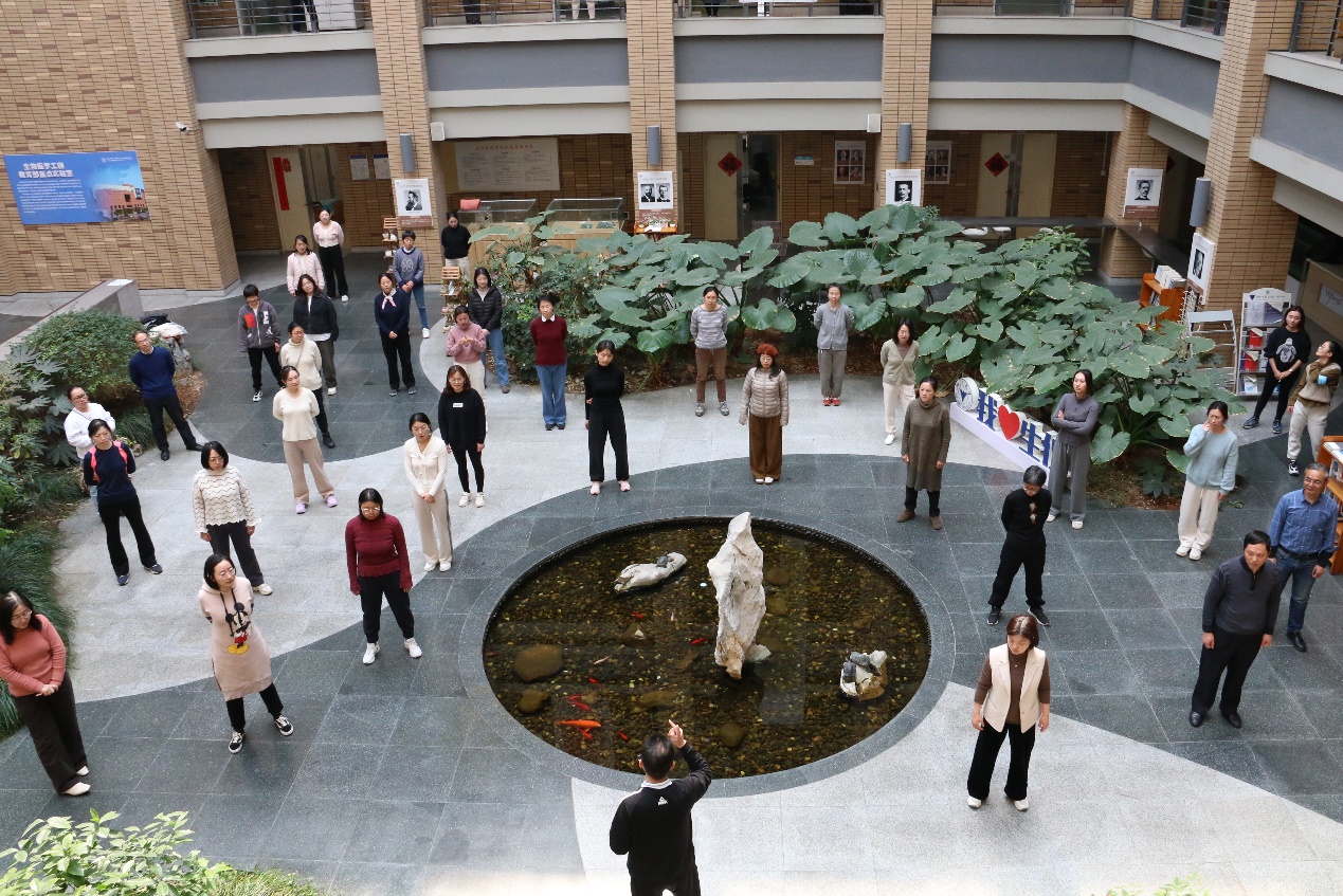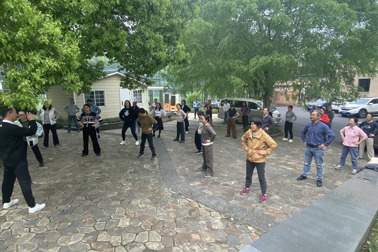 此次八段锦课程邀请了国家级气功健身专家俞建社老师全程授课,课程受到广大教职工的热烈响应和积极参与,自2024年3月12日开班以来, 12次课程,前后历时3个月,共有来自学校11个院级单位的四十余名教职工报名参与。从春分到夏至,从周亦卿楼通透敞亮的二楼平台到绿树成荫的室外广场,教职工们在俞教练的专业指导下学习八段锦的动作要领、领会八段锦的精神内涵,舒缓身心疲劳,强身健体。