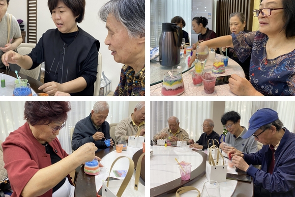 当香薰精油沙画蜡烛制作完成时,离退休教师们兴奋地举起自己的作品合影留念,分享制作过程中的心得和喜悦。