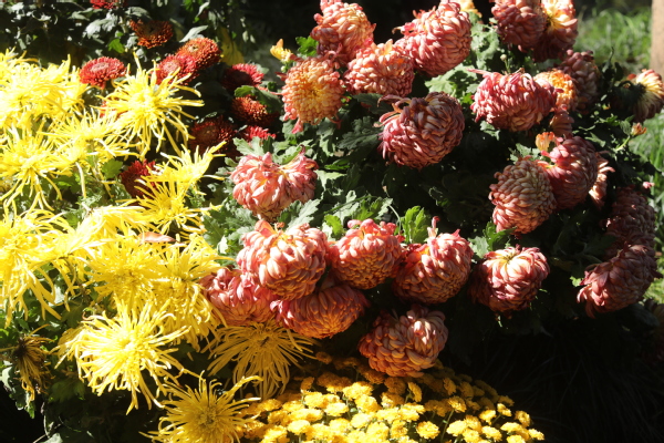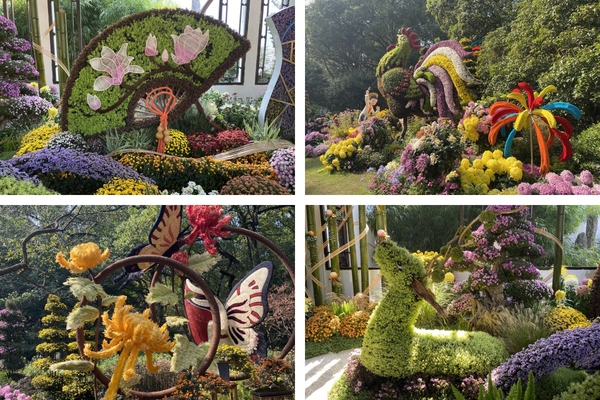 漫步植物园,造型独特的一幅幅菊花作品在眼前慢慢展开,令人心旷神怡。“菊影越韵”以两朵绽放的菊花为核心意象,巧妙地融入了中国传统戏曲《梁山伯与祝英台》中“化蝶”这一经典桥段,体现了菊花之清雅韵致与越剧之婉转美丽的完美交融。“良渚遗韵·盛世菊香”通过菊花艺术造型向观众展现了一条薪火相传、弦歌不断的溯源文明圣地之旅游线。各色细腻的叶脉,点缀其间、色彩斑斓的小菊花,丰富多彩的元素共同编织出一幅既自然生动又富含文化底蕴的画面。通过植物材料的巧妙搭配与细腻的制作,展现了菊花傲霜独立的高洁品格。