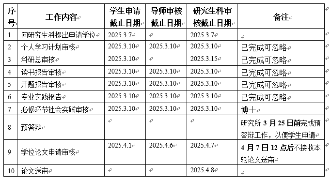 要求2025年6月10日前完成答辩,6月13日上午9:00-11:30、下午1:30-4:30提交相关材料至研究生科。请各位同学把握好论文质量和上传时间。毕业生登记表联系陈文政老师,其他材料联系黄琪老师。