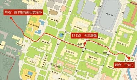 起点:正大门(拍照打卡)→毛主席像(拍照打卡)→终点:图书馆背面山坡凉亭(拍照打卡)。凭打卡照(个人或团体),作为领取纪念品的凭证。