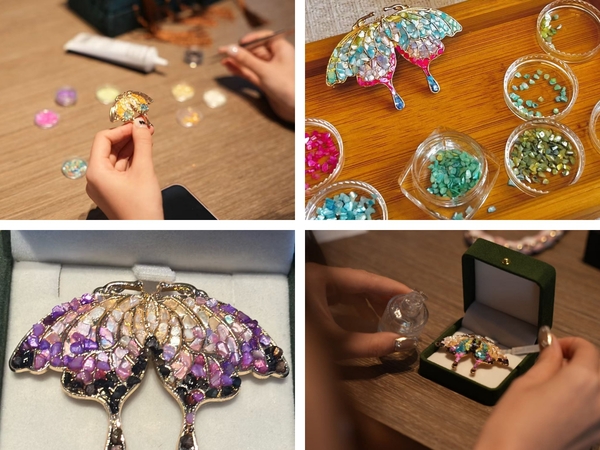 4. 主题简介:螺钿是一种历史悠久的传统工艺,将贝壳、螺类等材料磨制成薄片,镶嵌于器物表面。非遗螺钿胸针以金属为基底,把五彩斑斓的螺钿薄片精心切割、拼接,构成蝴蝶、花卉等精美图案,兼具螺钿的绚丽光泽与独特纹理,不仅是传统工艺的创新表达,更承载着深厚的文化底蕴。