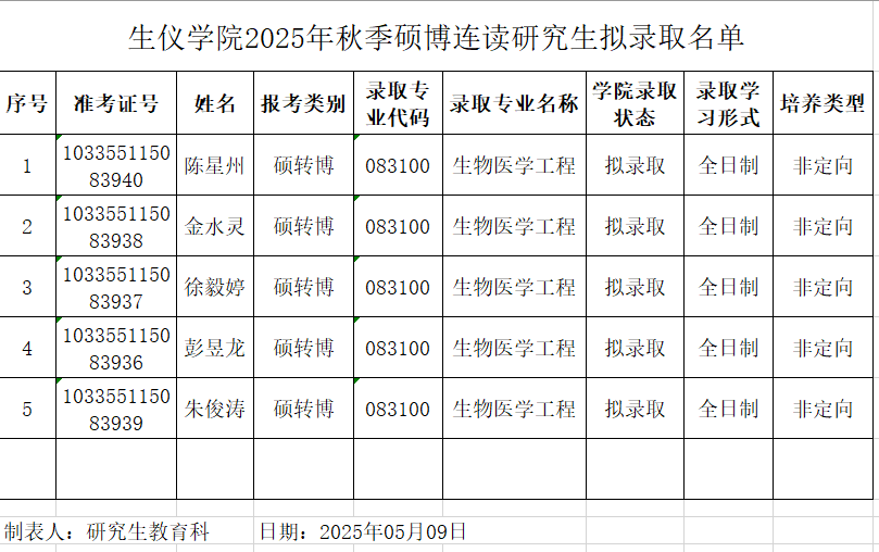 经考生本人申请,学院研究生科资格审查,相应研究所考核,学院研究生招生工作领导小组审核,学院2025年秋季硕博连读博士研究生拟录取名单确定,现给予公示,公示期为十个工作日(2025年05月09日至2025年05月18日)。如对公示名单及其相关内容有异议,均可以在公示期内以电话、电子邮件等形式向学院反映。公示受理联系方式,电话0571-87951086,邮箱:tangqin88@zju.edu.cn。