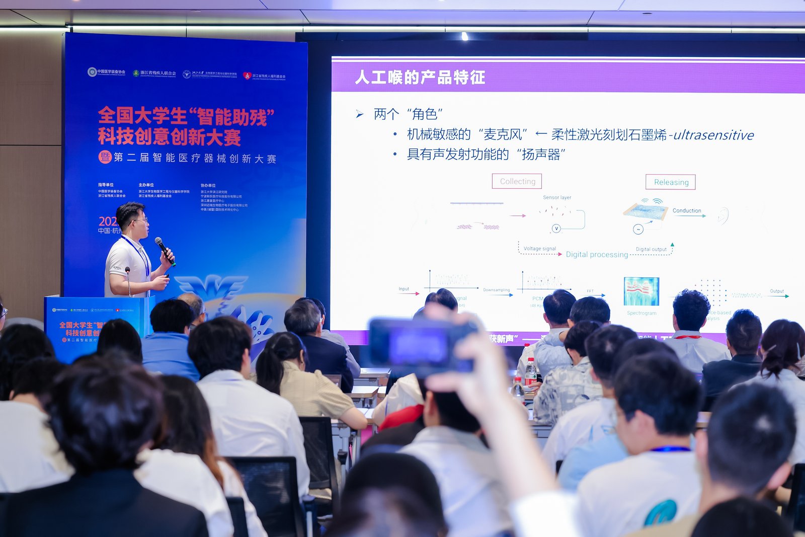 由清华大学任天令教授领衔指导的科研团队研发的全球首款柔性可穿戴智能人工喉系统脱颖而出,一举斩获本次大赛研究生组特等奖。“以往,像喉癌术后患者、渐冻症患者等语障人群,只能依靠电子喉或食管语进行发声,不仅音质单一,学习难度也极大。”任天令教授团队成员潘泽城介绍道,“我们创新性地将激光直写石墨烯技术与柔性压电传感器相融合,通过对患者畸变声音信号及喉部肌肉振动信号的多模态精准感知,成功实现了贴附式、无创的自然语音重建。这套系统不仅具备无声语音识别功能,还能实现主动发声,填补了国际人工喉语音重建技术领域的空白。”