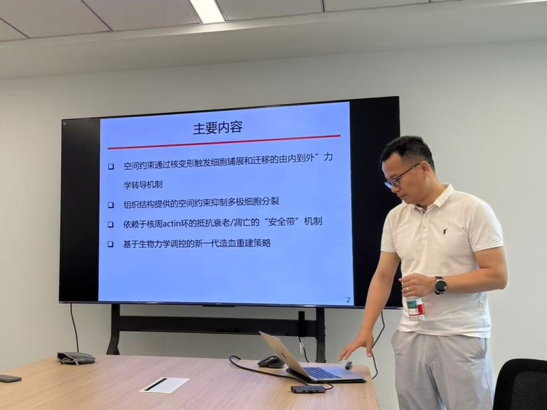 讲座现场气氛热烈,师生们积极互动,进行了深入交流。姜教授条理清晰地向大家展示了他们实验室在细胞骨架力学上的理论基础,以及细胞力学在细胞迁移、分裂,以及造血干/祖细胞的归巢和植入的关键作用与机制,这为细胞骨架力学研究提供了全新的视角,引发了学生和老师们的浓厚兴趣和热烈讨论。他耐心解答了大家在理论知识和实验操作等多个方面的疑惑,同时分享了自己的学术心得与未来展望。